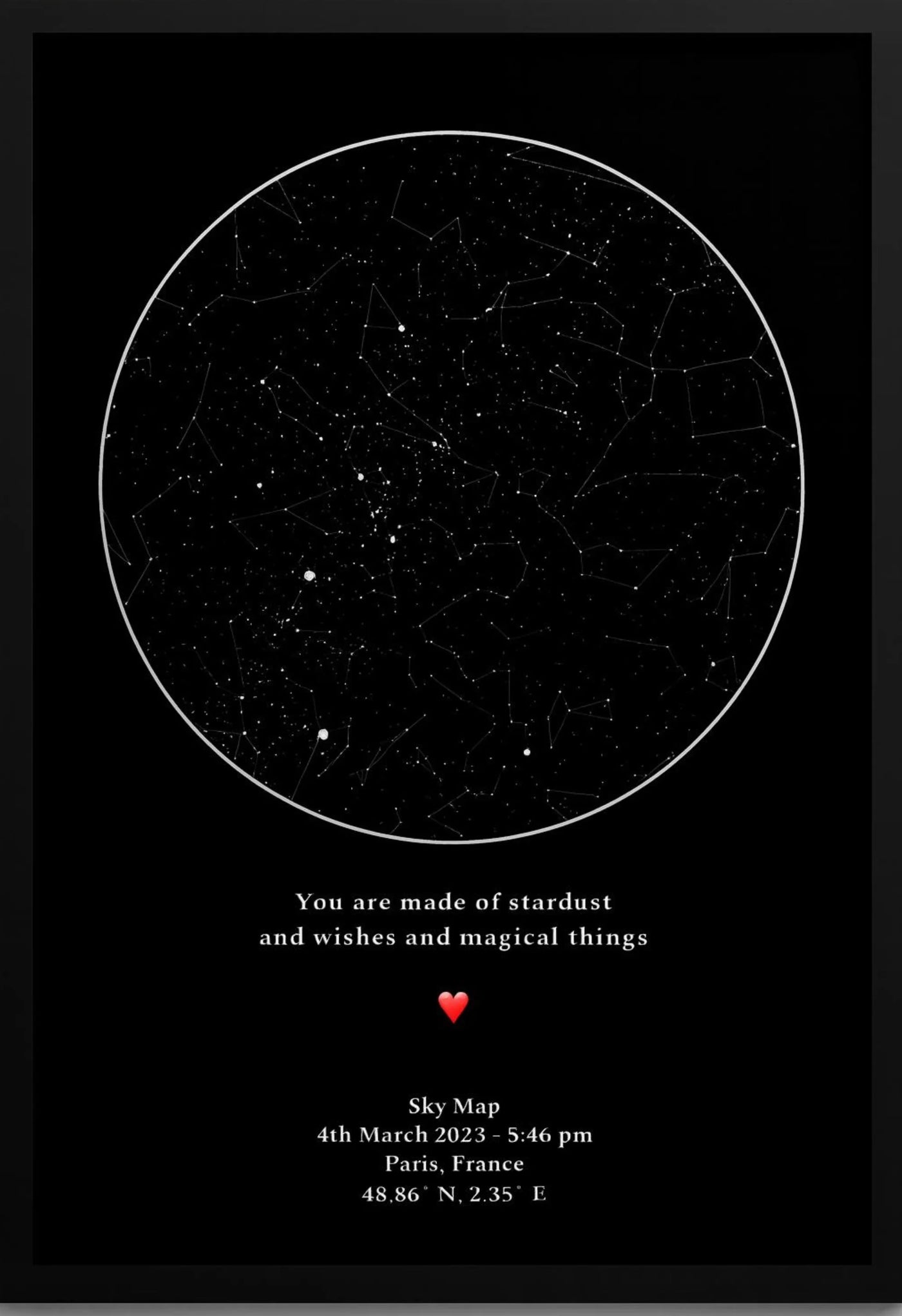 Life is made of moments—tiny snapshots in time that define our stories. A star map allows you to hold on to those memories in a way that is both timeless and meaningful. Imagine looking at your wall and being transported back to the very night your story began—seeing the stars exactly as they were, frozen in time, just for you.